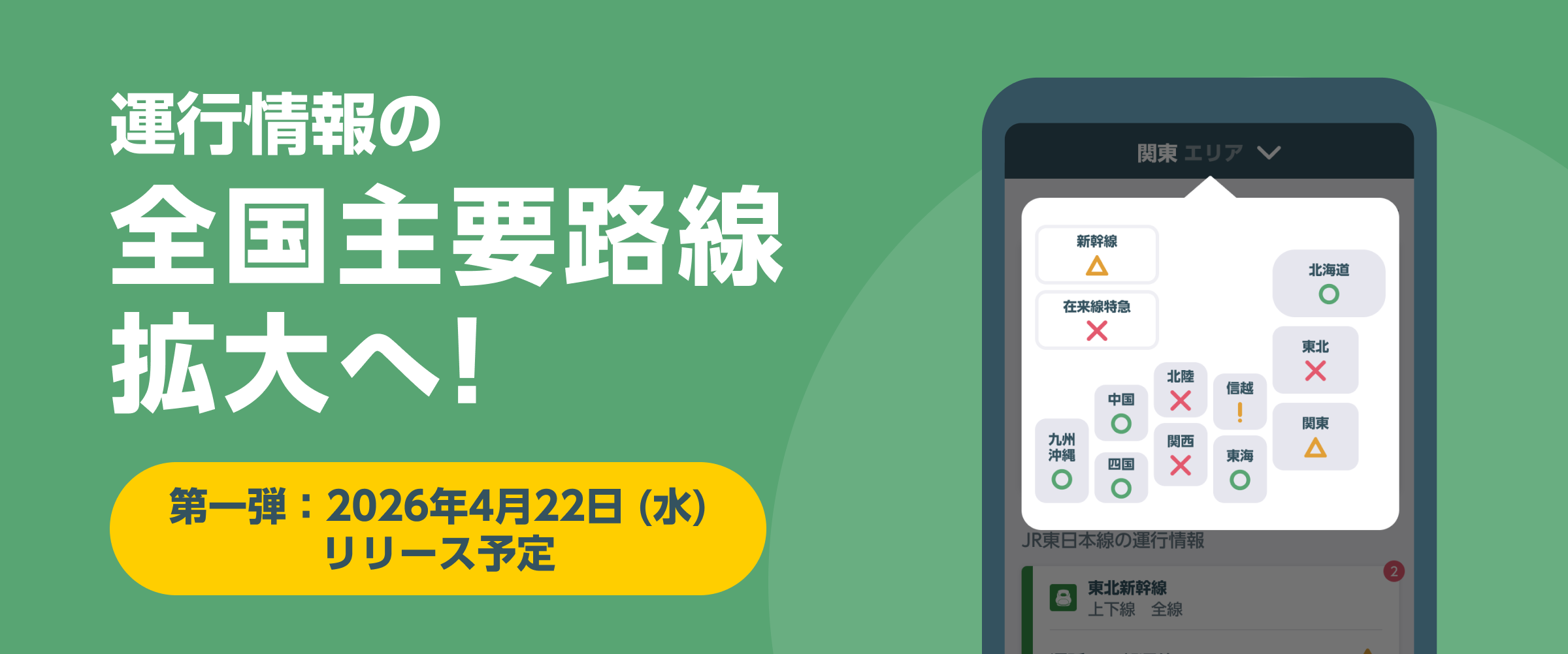 今回のリリースでは全国の運行情報対応に向けた第一弾として、東北エリア・信越エリア・関東エリア・在来線特急・新幹線の運行情報対応事業者を拡大いたします。今後の対応エリアの拡大にもご期待ください。
